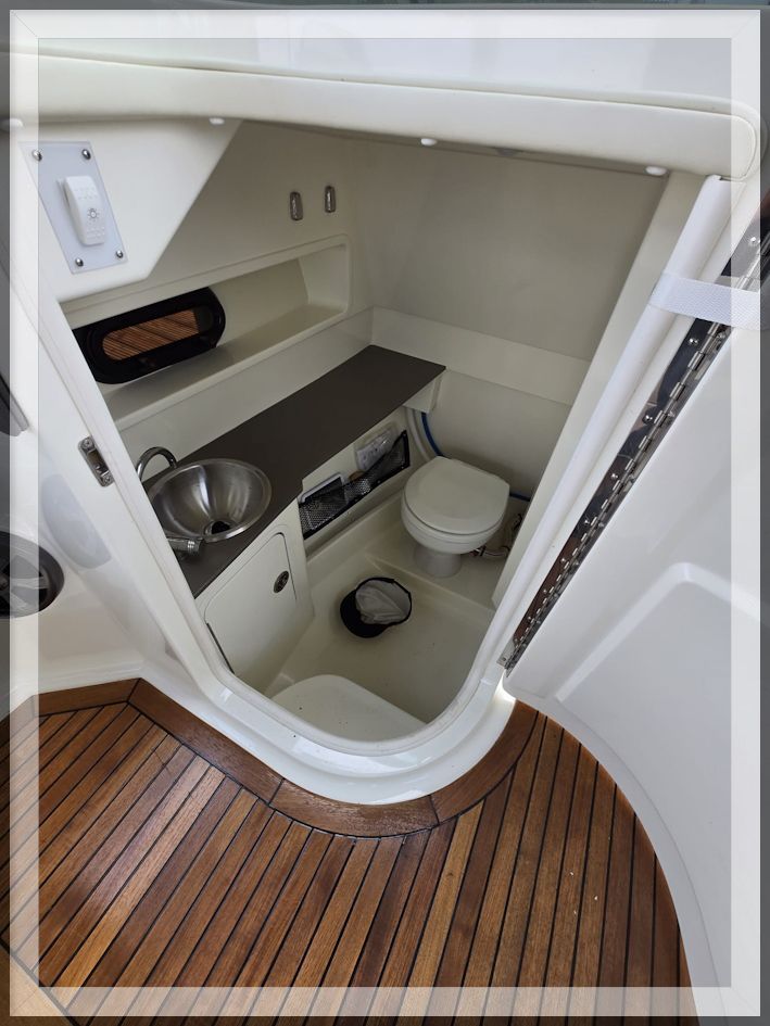 Bugstrahlruder, Radio, Fender, Winterplane (Anfertigung), leichte Sommerplane, Teak-Fußboden, große Liegefläche, Badeplattform, Sportgeräteträger mit Subwoofer-Boxen